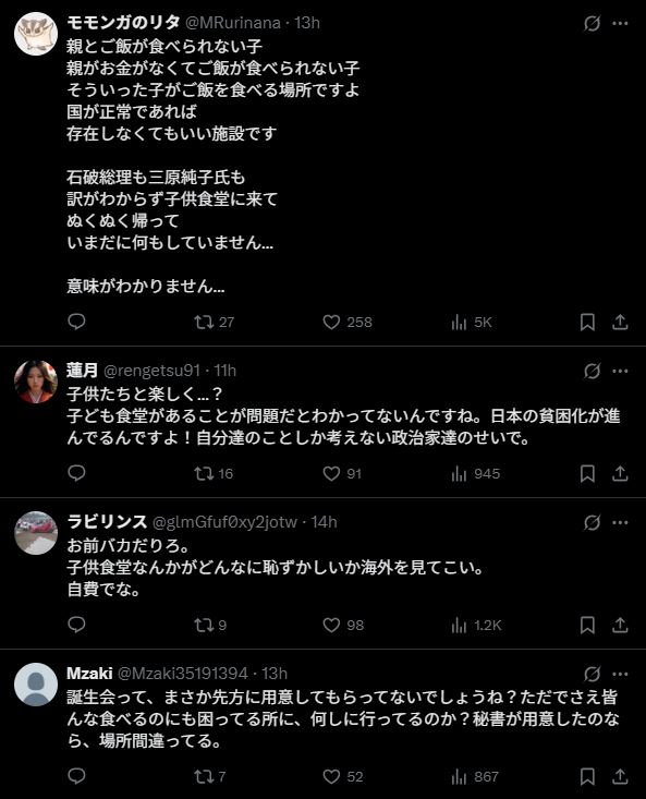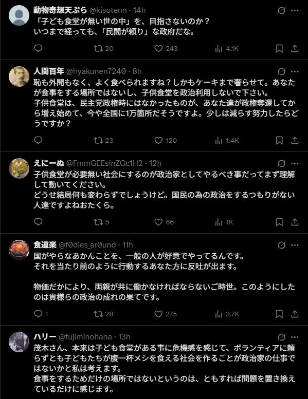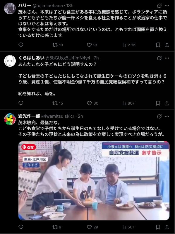 ところが、政治家がその場を訪れたことをきっかけにSNSで大炎上しました。批判の矛先が向けられたのは自民党幹事長・茂木敏充氏。彼が子ども食堂で誕生日祝いを受けたことをSNSに投稿したことで、「パフォーマンス政治だ」「子どもを利用するな」と強い反発を呼んでいます。